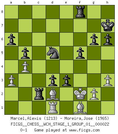 Last move : 0-1 2020 March 18 16:33:46 [Event "FICGS__CHESS__WCH_STAGE_1_GROUP_01__000022"] [Site "FICGS"] [Date "2020.03.01"] [Round "1"] [White "Marcel,Alexis"] [Black "Moreira,Jose"] [Result "0-1"] [WhiteElo "1213"] [BlackElo "1965"] 1.f4 d5 2.Nf3 Bf5 3.e3 Nf6 4.Be2 e6 5.O-O h6 6.b3 Bd6 7.Bb2 O-O 8.Nc3 a6 9.Nd4 Bh7 10.d3 c5 11.Nf3 Nc6 12.a3 d4 13.exd4 cxd4 14.Ne4 Bxe4 15.dxe4 Bxf4 16.Nd2 Qc7 17.h3 Be3+ 18.Kh1 Bxd2 19.Qxd2 Nxe4 20.Qe1 Ng3+ 21.Kg1 Nxf1 22.Qxf1 e5 23.Bd3 g6 24.Re1 f5 25.Bc4+ Kh7 26.Bd5 Ne7 27.Bc4 b5 28.Be2 Qxc2 29.Bc1 Nd5 30.b4 e4 31.Qf2 d3 32.Bf1 Qxf2+ 33.Kxf2 Rac8 34.Bd2 Rc2 35.Rd1 e3+ 0-1 Bird's Opening Kingside Castling by player White (move 5) Kingside Castling by player Black (move 7) Player Black won this chess game. Follow this game move after move (download)Whoever sees no other aim in the game than that of giving checkmate to one's opponent will never become a good Chess player. (Euwe) Ich spiele ehrlich und spiele, um zu gewinnen. Wenn ich verliere nehme ich meine Medizin. (Robert James Fischer) A través de las casillas del tablero, los Indios explican el movimiento del tiempo y la edad, las influencias mas altas que controlan el mundo y los lazos que vinculan al Ajedrez con el alma humana. (Al-Masudi) Des idées, des idées, j'en ai cent, j'en ai mille. Des bonnes, des mauvaises, applicables, irréalisables... Il suffit de faire le tri ! (Roos) The right perception of any matter and a misunderstanding of the same matter do not wholly exclude each other. (Kafka's the trial)