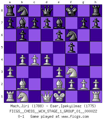 Last move : 0-1 2020 May 23 2:48:43 [Event "FICGS__CHESS__WCH_STAGE_1_GROUP_01__000022"] [Site "FICGS"] [Date "2020.03.01"] [Round "1"] [White "Mach,Jiri"] [Black "Eser,Ipekyilmaz"] [Result "0-1"] [WhiteElo "1788"] [BlackElo "1775"] 1.b4 f6 2.Bb2 f5 3.a3 Nf6 4.d4 e6 5.c4 b6 6.e3 Bb7 7.Nf3 Be7 8.Be2 Kf8 0-1 Polish (Sokolsky) opening Player Black won this chess game. Follow this game move after move (download)The essence of Chess is thinking about what Chess is. (David Bronstein) Obwohl ich vom Stil her kaum zu den Priestern der Schachkunst gezählt werde, halte ich Schach doch für eine Kunst. (Tigran Petrosjan) Cuando la partida de Ajedrez termina, el Peón y el Rey regresan a la misma caja. (Irish saying) La menace est plus forte que l'exécution. (Aaron Nimzovitch) Unless in communicating with it one says exactly what one means, trouble is bound to result. (Alan Turing, about computers)