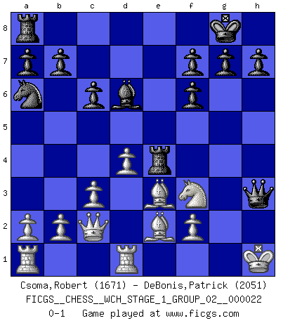 Last move : 0-1 2020 May 1 21:46:48 [Event "FICGS__CHESS__WCH_STAGE_1_GROUP_02__000022"] [Site "FICGS"] [Date "2020.03.01"] [Round "1"] [White "Csoma,Robert"] [Black "DeBonis,Patrick"] [Result "0-1"] [WhiteElo "1671"] [BlackElo "2051"] 1.e4 c6 2.d4 d5 3.Nc3 dxe4 4.Nxe4 Nf6 5.Nxf6+ exf6 6.Nf3 Bd6 7.Bd3 O-O 8.O-O Re8 9.h3 Na6 10.c3 Be6 11.Be3 Qd7 12.Qc2 Bxh3 13.gxh3 Qxh3 14.Be2 Qg4+ 15.Kh1 Re4 16.Rfd1 Qh3+ 0-1 Caro-Kann : Tartakower (Nimzovich) variation Kingside Castling by player Black (move 7) Kingside Castling by player White (move 8) Player Black won this chess game. Follow this game move after move (download)The most important feature of the Chess position is the activity of the pieces. This is absolutely fundamental in all phases of the game: Opening, Middlegame and especially Endgame. The primary constraint on a piece's activity is the Pawn structure. (Michael Stean) Rubinstein ist ein Turmendspiel, welches die Götter vor tausenden von Jahren begannen. (Savielly Grigorievitsch Tartakower) Sin errores no puede haber brillantez. (Emanuel Lasker) Ce qui est bien, c'est d'avoir tout un tas de pièces en prise : l'adversaire ne peut en prendre qu'une à la fois. Cité par Thierry Audin. Mandala - that's it! 16x16 squares as multiple of the four and the eight because of the Four Noble Truths and the Noble Eightfold Path. (Heinz-Georg Lehnhoff about Big Chess)
