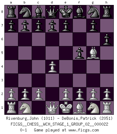 Last move : 0-1 2020 April 12 4:43:57 [Event "FICGS__CHESS__WCH_STAGE_1_GROUP_02__000022"] [Site "FICGS"] [Date "2020.03.01"] [Round "1"] [White "Rivenburg,John"] [Black "DeBonis,Patrick"] [Result "0-1"] [WhiteElo "1011"] [BlackElo "2051"] 1.d4 f5 2.Bg5 h6 0-1 This chess game has been lost on time (started : 2020.03.01 23:43:21) Dutch, 2.Bg5 variation Player Black won this chess game. Follow this game move after move (download)Fischer is completely natural. He plays no roles. He's like a child. Very, very simple. (Zita Rajcsanyi) Computer sind die einzigen Gegner, die nicht immer eine Ausrede auf Lager haben, wenn sie gegen mich verlieren. (Robert James Fischer) Fischer es el jugador mas fuerte del mundo. De hecho, el jugador mas fuerte que jamas haya existido. (Larry Evans) J'ai toujours senti une vague pitié pour l'homme qui ne connaît rien aux échecs, tout comme j'en aurais pour un homme ignorant de l'amour. Les Echecs, comme la musique ou comme l'amour, ont le pouvoir de rendre heureux. (Siegbert Tarrasch) See no evil, hear no evil, speak no evil. (The 3 monkeys)