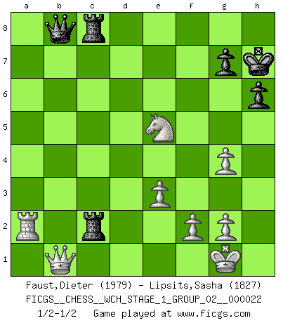 Last move : 1/2-1/2 2020 April 27 14:12:45 [Event "FICGS__CHESS__WCH_STAGE_1_GROUP_02__000022"] [Site "FICGS"] [Date "2020.03.01"] [Round "1"] [White "Faust,Dieter"] [Black "Lipsits,Sasha"] [Result "1/2-1/2"] [WhiteElo "1979"] [BlackElo "1827"] 1.Nf3 d5 2.d4 Nf6 3.Bf4 e6 4.e3 Bd6 5.Bg3 O-O 6.c4 b6 7.a3 c5 8.Nc3 Bb7 9.dxc5 bxc5 10.Be2 Bxg3 11.hxg3 Nbd7 12.Qc2 h6 13.O-O Rc8 14.Rad1 Qc7 15.Rfe1 Rfd8 16.Rc1 Qc6 17.Red1 Qb6 18.b3 Re8 19.Rd2 Ba8 20.cxd5 exd5 21.Qd1 a5 22.Bb5 Qd6 23.Bxd7 Qxd7 24.Na4 Qe7 25.Rdc2 c4 26.Nb2 Qxa3 27.bxc4 dxc4 28.Nxc4 Qb4 29.Rb2 Qe7 30.Rb5 a4 31.Ra5 Rc7 32.Nfe5 Bd5 33.Rxd5 Nxd5 34.Qxd5 Rc5 35.Qd1 Qc7 36.Ra1 f6 37.Qxa4 Rd8 38.Qa2 fxe5 39.Nxe5 Kh7 40.Qb1+ Rc2 41.Ra2 Rc8 42.g4 Qb8 1/2-1/2 Reti Opening Kingside Castling by player Black (move 5) Kingside Castling by player White (move 13) This chess game ended in a draw. Follow this game move after move (download)Up to this point White has been following well-known analysis. But now he makes a fatal error: he begins to use his own head. (Siegbert Tarrasch) Wenn ein Kopf und ein Buch zusammenstoßen und es klingt hohl, ist es denn allemal im Buche? (Georg Christoph Lichtenberg) Los errores estan ahí, esperando a que se cometan. (Savielly Tartakower) Votre prénom est 'Tactique', votre deuxième prénom est 'Tactique' et votre nom est 'Tactique'. (Ken Smith) I'm extremely disappointed. I send you out for exciting, new designer drugs, you come back with tomato sauce. (Gregory House, House M.D.)