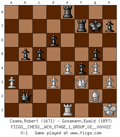 Last move : 0-1 2020 April 16 7:54:53 [Event "FICGS__CHESS__WCH_STAGE_1_GROUP_02__000022"] [Site "FICGS"] [Date "2020.03.01"] [Round "1"] [White "Csoma,Robert"] [Black "Gossmann,Ewald"] [Result "0-1"] [WhiteElo "1671"] [BlackElo "1897"] 1.c4 c5 2.Nc3 Nc6 3.Nf3 g6 4.g3 Bg7 5.Bg2 d6 6.O-O Bf5 7.e4 Bg4 8.h3 Bxf3 9.Bxf3 Qd7 10.Kh2 e6 11.d3 Nd4 12.Bg2 Ne7 13.Be3 Rc8 14.Qd2 O-O 15.Bh6 Bxh6 16.Qxh6 f6 17.Qd2 Kg7 18.Ne2 Nxe2 19.Qxe2 Nc6 20.Qd2 e5 21.f4 exf4 22.Rxf4 Qe8 23.Raf1 Rd8 24.Qf2 Qe5 25.Qd2 a6 26.R1f3 b5 27.Kh1 Nd4 28.Re3 Rde8 29.cxb5 axb5 30.a3 Rf7 31.Qf2 f5 32.Re1 g5 33.Rf3 Nxf3 34.Qxf3 f4 35.g4 Qxb2 0-1 English : Symmetrical variation Kingside Castling by player White (move 6) Kingside Castling by player Black (move 14) Player Black won this chess game. Follow this game move after move (download)It was clear to me that the vulnerable point of the American Grandmaster (Bobby Fischer) was in double-edged, hanging, irrational positions, where he often failed to find a win even in a won position. (Efim Geller) Wenn du auf das Glück wartest, wird das Leben ziemlich langweilig. (Mikhail Nekhemyevich Tal) De eso se trata el Ajedrez. Un día le das una lección a tu oponente y al día siguiente el te da una a tí. (Bobby Fischer) Les écrivains ont utilisé les échecs pour analyser les côtés extrêmes de la nature humaine. Dans ce cadre, les échecs offrent un champ d'expérimentation idéal. Mais on pourrait faire la même chose avec la peinture. Et là, en vous référant à Van Gogh, vous ne tirerez pas de conclusion définitive sur les peintres. (Gary Kasparov) Life is painting a picture, not doing a sum. (Oliver Wendell Holmes, Jr.)