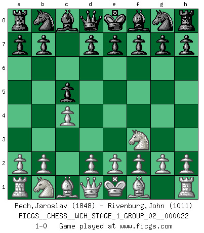 Last move : 1-0 2020 May 7 8:43:29 [Event "FICGS__CHESS__WCH_STAGE_1_GROUP_02__000022"] [Site "FICGS"] [Date "2020.03.01"] [Round "1"] [White "Pech,Jaroslav"] [Black "Rivenburg,John"] [Result "1-0"] [WhiteElo "1848"] [BlackElo "1011"] 1.c4 c5 2.Nf3 1-0 This chess game has been lost on time (started : 2020.03.01 23:43:21) English : Symmetrical variation Player White won this chess game. Follow this game move after move (download)I love all positions. Give me a difficult positional game, I will play it. But totally won positions, I cannot stand them. (Hein Donner) Der Umstand, daß uns eine 7 Stunden Zeitkontrolle ermöglicht eine großartige, tiefe Partie zu spielen, ist für die Massenmedien nicht weiter von Bedeutung. (Alexej Shirov) Hay jugadores fuertes y personas amables y yo soy un jugador fuerte. (Bobby Fischer) Il vaut toujours mieux jouer un plan faux de façon logique que de n'avoir pas de plan du tout. (Victor Kortchnoï) The absolute truth is the thing that makes people laugh. (Carl Reiner)