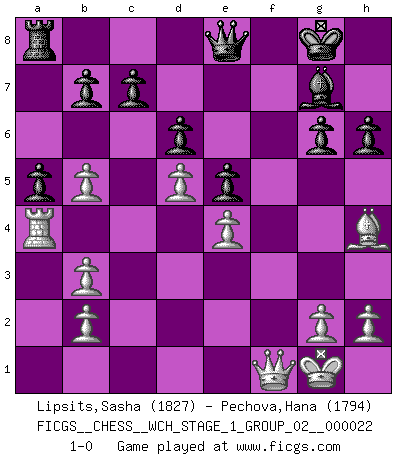Last move : 1-0 2020 June 10 6:12:29 [Event "FICGS__CHESS__WCH_STAGE_1_GROUP_02__000022"] [Site "FICGS"] [Date "2020.03.01"] [Round "1"] [White "Lipsits,Sasha"] [Black "Pechova,Hana"] [Result "1-0"] [WhiteElo "1827"] [BlackElo "1794"] 1.d4 Nf6 2.Nf3 g6 3.c4 Bg7 4.Nc3 O-O 5.e4 d6 6.Be2 e5 7.d5 a5 8.Bg5 h6 9.Bh4 Na6 10.Nd2 Nc5 11.O-O Bd7 12.f3 Qe8 13.Nb3 Nxb3 14.axb3 Nh5 15.Qd2 f5 16.Nb5 Bxb5 17.cxb5 fxe4 18.fxe4 Nf4 19.Ra4 Nxe2+ 20.Qxe2 Rxf1+ 21.Qxf1 1-0 King's Indian : East Indian defense Kingside Castling by player Black (move 4) Kingside Castling by player White (move 11) Player White won this chess game. Follow this game move after move (download)When in doubt... play Chess ! (Tevis) Schach wird sich dank seiner hohen kulturellen Tradition immer durchsetzen. In näherer Zukunft womöglich sogar als Gegenreaktion auf die maßlose Reizüberflutung im Freizeit- und Spielbereich. (Garry Kasparov) En el Ajedrez, tal como en la vida, las bendiciones de hoy pueden ser el veneno del mañana. (Assaic) Les échecs sont plus proches de l'art de l'assassinat que de l'art de la guerre. (Arturo Perez-Reverte) A government big enough to give you everything you want is strong enough to take everything you have. (Thomas Jefferson)