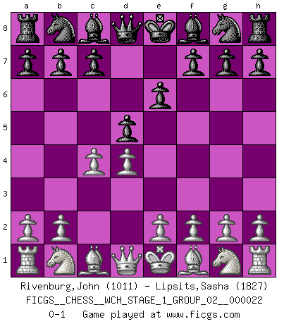 Last move : 0-1 2020 April 6 15:28:19 [Event "FICGS__CHESS__WCH_STAGE_1_GROUP_02__000022"] [Site "FICGS"] [Date "2020.03.01"] [Round "1"] [White "Rivenburg,John"] [Black "Lipsits,Sasha"] [Result "0-1"] [WhiteElo "1011"] [BlackElo "1827"] 1.d4 d5 2.c4 e6 0-1 This chess game has been lost on time (started : 2020.03.01 23:43:21) Queen's gambit declined Player Black won this chess game. Follow this game move after move (download)It is difficult to play against Einstein's theory --on his first loss to Fischer. (Mikhail Tal) Es ist nicht das erste mal, dass sich die FIDE dem Arabischen Geld gebeugt hat (über die FIDE WM 2004 in Lybien). (Larry Evans) No es tiempo de jugar al Ajedrez cuando la casa esta en llamas. (Proverbio Italiano) Ce n'est pas pour s'amuser qu'il joue aux échecs : il célèbre un culte. (Vladimir Nabokov) At work, the authority of a person is inversely proportional to the number of pens that person is carrying. (Dan Rotaru)