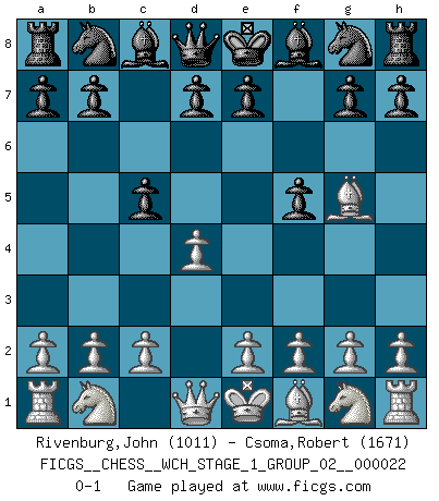 Last move : 0-1 2020 April 8 9:17:37 [Event "FICGS__CHESS__WCH_STAGE_1_GROUP_02__000022"] [Site "FICGS"] [Date "2020.03.01"] [Round "1"] [White "Rivenburg,John"] [Black "Csoma,Robert"] [Result "0-1"] [WhiteElo "1011"] [BlackElo "1671"] 1.d4 f5 2.Bg5 c5 0-1 This chess game has been lost on time (started : 2020.03.01 23:43:21) Dutch, 2.Bg5 variation Player Black won this chess game. Follow this game move after move (download)What is the difference between chess and football? Everybody understands football, but nobody plays it. Everybody plays chess, but nobody understands it. Everything is relative. (Vladimir Kramnik) Wenn Capablanka heute auf der Schachbühne erscheinen würde, hätte er ein halbes Jahr gebraucht um sich die Schachtheorie anzueignen. Und dann hätte er alles und jeden besiegt. (Mikhail Moiseyevich Botvinik) Del Ajedrez se ha dicho que la vida no es lo suficientemente larga para él, pero eso es culpa de la vida, no del Ajedrez. (William Ewart Napier) Aidez vos pièces, elles vous aideront. (Paul Morphy) Somewhere in the world there is an epigram for every dilemma. (Hendrik Willem van Loon)