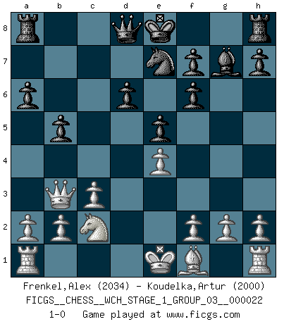 Last move : 1-0 2020 May 23 3:20:35 [Event "FICGS__CHESS__WCH_STAGE_1_GROUP_03__000022"] [Site "FICGS"] [Date "2020.03.01"] [Round "1"] [White "Frenkel,Alex"] [Black "Koudelka,Artur"] [Result "1-0"] [WhiteElo "2034"] [BlackElo "2000"] 1.e4 c5 2.Nf3 Nc6 3.d4 cxd4 4.Nxd4 Nf6 5.Nc3 e5 6.Ndb5 d6 7.Bg5 a6 8.Na3 b5 9.Bxf6 gxf6 10.Nd5 Be6 11.c3 Bg7 12.Nc2 Bxd5 13.Qxd5 Ne7 14.Qb3 1-0 Sicilian : Pelikan (Lasker/Sveshnikov) variation Player White won this chess game. Follow this game move after move (download)Bobby just drops the pieces and they fall on the right squares. (Miguel Najdorf) Sie bekommen vielleicht den Eindruck, dass die Spitzenspieler überhaupt gar nicht so stark sind. Aber das stimmt nicht. Es ist eine Illusion. Mit einem Computer an der Seite ist es sehr leicht, Urteile zu fällen, aber wenn man alleine am Brett sitzt, sieht die Sache ganz anders aus. (Vladimir Kramnik) Debió haber existido una vez en que los hombres eran semidióses, de otra manera no hubiesen podido inventar el Ajedrez. (Gustav Schenk) Les erreurs sont comme les malheurs, elles n'arrivent jamais seules. (Siegbert Tarrasch) I have opinions of my own - strong opinions - but I don't always agree with them. (George Bush)