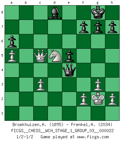 Last move : 1/2-1/2 2020 April 12 18:40:56 [Event "FICGS__CHESS__WCH_STAGE_1_GROUP_03__000022"] [Site "FICGS"] [Date "2020.03.01"] [Round "1"] [White "Broekhuizen,A. T. S."] [Black "Frenkel,Alex"] [Result "1/2-1/2"] [WhiteElo "1895"] [BlackElo "2034"] 1.e4 e5 2.Nf3 Nc6 3.Bb5 a6 4.Ba4 Nf6 5.O-O Be7 6.Re1 b5 7.Bb3 O-O 8.c3 d6 9.a4 b4 10.d3 Rb8 11.Nbd2 Na5 12.Ba2 c5 13.Nc4 Nc6 14.Ne3 Be6 15.Nd5 Re8 16.Nd2 bxc3 17.bxc3 Na5 18.Nxf6+ Bxf6 19.Bxe6 Rxe6 20.Nf1 Re7 21.Ne3 Nb3 22.Rb1 Nxc1 23.Rxb8 Qxb8 24.Nd5 Rb7 25.Qxc1 Bd8 26.g3 Rb2 27.d4 Qb3 28.dxe5 dxe5 29.Qe3 Rb1 30.Rxb1 Qxb1+ 31.Kg2 Qc2 32.a5 Qb1 33.Qxc5 Qxe4+ 34.Kg1 Qe1+ 35.Kg2 Qe4+ 36.Kg1 Qe1+ 37.Kg2 Qe4+ 1/2-1/2 Ruy Lopez : Closed, 7...O-O Kingside Castling by player White (move 5) Kingside Castling by player Black (move 7) This chess game ended in a draw. Follow this game move after move (download)You can only get good at Chess if you love the game. (Bobby Fischer) Heutzutage gewinnt im Turnier nicht derjenige Spieler, der weitreichende Pläne entwirft, sondern einfach jener, der Zug um Zug kämpft. (David Bronstein) Creo que una cierta cantidad de temperamento es esperada de los genios del Ajedrez. (Ron Gross) Que feriez-vous si vous étiez en train de jouer aux échecs et que la fin du monde arrive ? Je continuerais à jouer. (Saint Borromée) Depression is just anger without enthusiasm. (Unknown)