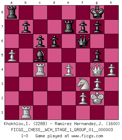 Last move : 1-0 2007 November 6 6:44:29 [Event "FICGS__CHESS__WCH_STAGE_1_GROUP_01__000003"] [Site "FICGS"] [Date "2007.07.11"] [Round "1"] [White "Khokhlov,Igor"] [Black "Ramirez Hernandez,Jose Antonio"] [Result "1-0"] [WhiteElo "2288"] [BlackElo "1600"] 1.e4 e5 2.Nf3 Nc6 3.Bc4 Bc5 4.d3 Nf6 5.O-O O-O 6.c3 Re8 7.b4 Bb6 8.a4 a6 9.Qb3 Qe7 10.a5 Ba7 11.Nbd2 d6 12.Re1 h6 13.h3 Nh5 14.Bb2 Nf4 15.d4 Qf6 16.Kh2 Qg6 17.Bf1 Be6 18.Qa4 Bd7 19.g3 exd4 20.cxd4 Ne6 21.Ra3 Ng5 22.Nxg5 hxg5 23.b5 Nxd4 24.Bxd4 axb5 25.Bxb5 Bxb5 26.Qxb5 Bxd4 27.Kg2 Bc5 28.Ra4 Rab8 29.Qd7 c6 30.Rb1 Qf6 31.Nf3 Re7 32.Qg4 Rbe8 33.Rc4 Ra8 34.h4 1-0 This chess game has been lost on time (started : 2007.07.11 16:47:33) Giuoco Pianissimo Kingside Castling by player White (move 5) Kingside Castling by player Black (move 5) Player White won this chess game. Follow this game move after move (download)As one by one I mowed them down, my superiority soon became apparent. (Jose Capablanca) Wenn ein Kopf und ein Buch zusammenstoßen und es klingt hohl, ist es denn allemal im Buche? (Georg Christoph Lichtenberg) Si un gobernante no entiende al Ajedrez, ¿como puede governar él un reinado?. (El Rey Khusros II) On n'a jamais que l'âge auquel on a commence à jouer aux échecs car après on cesse de vieillir. (Capablanca) The only thing that overcomes hard luck is hard work. (Harry Golden)