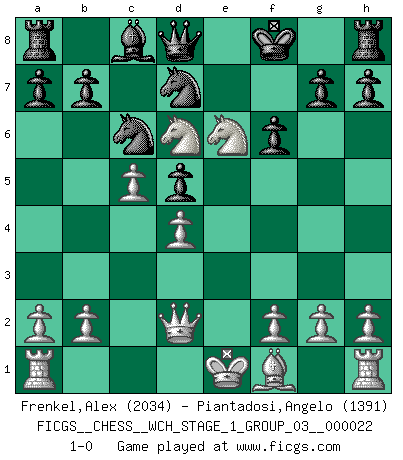 Last move : 1-0 2020 March 21 1:46:12 [Event "FICGS__CHESS__WCH_STAGE_1_GROUP_03__000022"] [Site "FICGS"] [Date "2020.03.01"] [Round "1"] [White "Frenkel,Alex"] [Black "Piantadosi,Angelo"] [Result "1-0"] [WhiteElo "2034"] [BlackElo "1391"] 1.e4 Nf6 2.e5 Nd5 3.d4 d6 4.Nf3 e6 5.c4 Nb6 6.exd6 cxd6 7.Nc3 d5 8.c5 N6d7 9.Bg5 Be7 10.Bxe7 Qxe7 11.Nb5 Qd8 12.Nd6+ Kf8 13.Qd2 Nc6 14.Ng5 f6 15.Nxe6+ 1-0 Alekhine's defense : Modern variation Player White won this chess game. Follow this game move after move (download)The blunders are all there on the board, waiting to be made. (Savielly Tartakover) Schach ist die gewalttätigste aller Sportarten. (Garry Kasparov) La vida es como el Ajedrez, con lucha, competición y eventos buenos y malos. (Benjamin Franklin) Le profane ne songe pas à la somme de jouissance dont il se prive, qui méconnaît ce jeu aux ressources aussi variées que passionnantes. (Jean-Marie Jeanton-Lamarche) There are more things in heaven and earth than practically anywhere else. (Unknown)