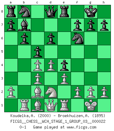 Last move : 0-1 2020 May 23 0:12:43 [Event "FICGS__CHESS__WCH_STAGE_1_GROUP_03__000022"] [Site "FICGS"] [Date "2020.03.01"] [Round "1"] [White "Koudelka,Artur"] [Black "Broekhuizen,A. T. S."] [Result "0-1"] [WhiteElo "2000"] [BlackElo "1895"] 1.d4 Nf6 2.c4 e6 3.Nc3 Bb4 4.e3 O-O 5.Bd3 b6 6.Nf3 Bb7 7.O-O Bxc3 8.bxc3 Re8 9.Rb1 d6 10.Nd2 e5 11.Re1 e4 12.Bc2 c5 0-1 This chess game has been lost on time (started : 2020.03.01 23:43:23) A. T. S. Broekhuizen Too bad you are out of time. Nimzo-Indian : 4.e3 O-O, 5.Bd3 Kingside Castling by player Black (move 4) Kingside Castling by player White (move 7) Player Black won this chess game. Follow this game move after move (download)It is the aim of the modern school, not to treat every position according to one general law, but according to the principle inherent in the position. (Richard Reti) Ich rechne überhaupt nicht voraus. Ich gewinne auch so. (Robert James Fischer) Muchos jugadores de Ajedrez se sorprendían cuando después de la partida, Fischer explicaba con calma: 'Yo ya había analizado esta posibilidad' en una posición en la cual yo creía que no era posible de prever desde la apertura. (Mikhail Tal) Psychologiquement, tu dois avoir confiance en toi même, mais cette confiance doit être basée sur des faits. (Robert Fischer) Thus, what is of supreme importance in war is to attack the enemy's strategy. (Sun Tzu)