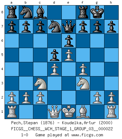 Last move : 1-0 2020 June 20 12:59:48 [Event "FICGS__CHESS__WCH_STAGE_1_GROUP_03__000022"] [Site "FICGS"] [Date "2020.03.01"] [Round "1"] [White "Pech,Stepan"] [Black "Koudelka,Artur"] [Result "1-0"] [WhiteElo "1876"] [BlackElo "2000"] 1.e4 e6 2.d4 d5 3.Nc3 Nf6 4.Bg5 Be7 5.e5 Nfd7 6.Bxe7 Qxe7 7.f4 O-O 8.Nf3 1-0 This chess game has been lost on time (started : 2020.03.01 23:43:23) French : Classical, Steinitz variation Kingside Castling by player Black (move 7) Player White won this chess game. Follow this game move after move (download)Any material change in a position must come about by mate, a capture, or a Pawn promotion. (Purdy) Ich spiele 70 Eröffnungssysteme. (Viktor Kortschnoi) El jugador de combinación piensa hacia adelante; comienza de la posición dada y trabaja las movidas contundentes en su mente. (Emanuel Lasker) Il vaut toujours mieux jouer un plan faux de façon logique que de n'avoir pas de plan du tout. (Victor Kortchnoï) Macintosh - we might not get everything right, but at least we knew the century was going to end. (Douglas Adams)