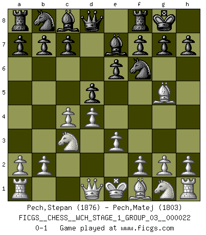 Last move : 0-1 2020 June 10 6:11:34 [Event "FICGS__CHESS__WCH_STAGE_1_GROUP_03__000022"] [Site "FICGS"] [Date "2020.03.01"] [Round "1"] [White "Pech,Stepan"] [Black "Pech,Matej"] [Result "0-1"] [WhiteElo "1876"] [BlackElo "1803"] 1.d4 d5 2.c4 e6 3.Nc3 Nf6 4.Bg5 Be7 5.e3 O-O 0-1 QGD : 4.Bg5 Be7, 5.e3 O-O Kingside Castling by player Black (move 5) Player Black won this chess game. Follow this game move after move (download)You know, comrade Pachman, I don't enjoy being a Minister, I would rather play Chess like you. (Che Guevara) Nach Morphy wurde nichts neues mehr in der Behandlung offener Positionen gefunden. (Mikhail Moiseyevich Botvinik) Si el Ajedrez es una ciencia, es la mas inexacta. Si el Ajedrez es un arte, es demasiado inexacto para ser visto como tal. Si el Ajedrez es un deporte, es demasiado esotérico. Si el Ajedrez es un juego, es demasiado exigente para ser solo un juego. Si el Ajedrez es una aventura, es una muy demandante. Si el Ajedrez es una pasión, es una muy gratificante. Si el Ajedrez es la vida, es una muy triste. (Anónimo) Que feriez-vous si vous étiez en train de jouer aux échecs et que la fin du monde arrive ? Je continuerais à jouer. (Saint Borromée) Coffee just isn't my cup of tea. (Unknown)