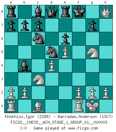 Last move : 1-0 2007 August 26 15:56:23 [Event "FICGS__CHESS__WCH_STAGE_1_GROUP_01__000003"] [Site "FICGS"] [Date "2007.07.11"] [Round "1"] [White "Khokhlov,Igor"] [Black "Barradas,Anderson"] [Result "1-0"] [WhiteElo "2288"] [BlackElo "1307"] 1.d4 d5 2.c4 Nf6 3.cxd5 Qxd5 4.Nc3 Qd8 5.Nf3 e6 6.e4 Bb4 7.Bd3 O-O 8.O-O Nc6 9.e5 Nd5 10.Bxh7+ Kxh7 11.Ng5+ Kg8 12.Qh5 Re8 13.Qxf7+ Kh8 14.Qh5+ Kg8 15.Qh7+ Kf8 16.Qh8+ 1-0 QGD : Marshall defense Kingside Castling by player Black (move 7) Kingside Castling by player White (move 8) Player White won this chess game. Follow this game move after move (download)Becoming successful at Chess allows you to discover your own personality. That's what I want for the kids I teach. (Saudin Robovic) Matt entspricht nicht immer den Tatsachen. (Savielly Grigorievitsch Tartakower) La maestría del Ajedrez consiste esencialmente en analizar posiciónes de Ajedrez con precisión. (Mikhail Botvinnik) Botvinnik disait en comparant les échecs à la musique: Il existe une science dont le but est l'étude de l'acoustique et des sons. Mais il y a aussi un art qui se sert de l'océan des sons : c'est la musique. De toute évidence, il en est de même pour la pensée. La logique est l'étude des lois de la réflexion et les échecs reflètent, en tant qu'art, le côté logique de la réflexion, sous la forme d'images artistiques... Extrait de Fischer - Spassky, Reykjavik 1972 par Alexander & F. Wyndham (Ed. Solar), p 37. The beginning of wisdom is silence. The second step is listening. (Unknown)