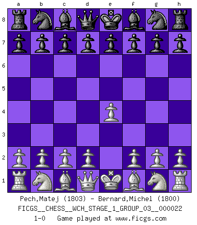 Last move : 1-0 2020 April 1 22:52:45 [Event "FICGS__CHESS__WCH_STAGE_1_GROUP_03__000022"] [Site "FICGS"] [Date "2020.03.01"] [Round "1"] [White "Pech,Matej"] [Black "Bernard,Michel"] [Result "1-0"] [WhiteElo "1803"] [BlackElo "1800"] 1.e4 1-0 This chess game has been lost on time (started : 2020.03.01 23:43:23) King's pawn Opening Player White won this chess game. Follow this game move after move (download)Chess is above all, a fight ! (Emanuel Lasker) Glücklicherweise sind Großmeister Ruben Fines reine Schachbücher weniger phallozentrisch [als seine Schachpsychologie] und deswegen auch weniger lächerlich. (Nigel Short) Yo nunca en mi vida he jugado la Defensa Francesa, que viene siendo la más aburrida de todas las Aperturas. (Wilhelm Steinitz) Donnez-moi un Cavalier en 6e et je gagnerais toutes mes parties. (Steinitz) Always be a first-rate version of yourself, instead of a second-rate version of somebody else. (Judy Garland)