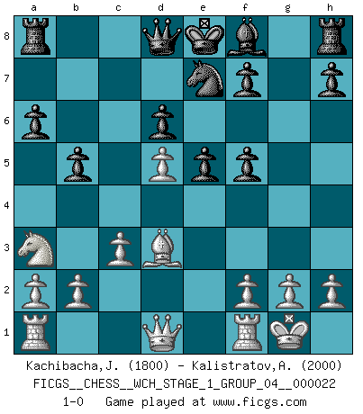 Last move : 1-0 2020 July 25 23:56:24 [Event "FICGS__CHESS__WCH_STAGE_1_GROUP_04__000022"] [Site "FICGS"] [Date "2020.03.01"] [Round "1"] [White "Kachibacha,Jobadi"] [Black "Kalistratov,Aleksandr"] [Result "1-0"] [WhiteElo "1800"] [BlackElo "2000"] 1.e4 c5 2.Nf3 Nc6 3.d4 cxd4 4.Nxd4 Nf6 5.Nc3 e5 6.Ndb5 d6 7.Bg5 a6 8.Na3 b5 9.Bxf6 gxf6 10.Nd5 f5 11.Bd3 Be6 12.O-O Bxd5 13.exd5 Ne7 14.c3 1-0 This chess game has been lost on time (started : 2020.03.01 23:43:35) Sicilian : Pelikan (Lasker/Sveshnikov) variation Kingside Castling by player White (move 12) Player White won this chess game. Follow this game move after move (download)Only the player with the initiative has the right to attack. (Wilhelm Steinitz) Es gibt keine einzige Frau, der ich nicht einen Springer vorgeben könnte und trotzdem gewänne. (Robert James Fischer) El Ajedrez es la vida. (Bobby Fischer) Les Echecs ont trois composantes : le temps, l'espace et le matériel en dernier. (Mikhail Tal) I feel so... helpless. (C-3PO in Star Wars ep.3)