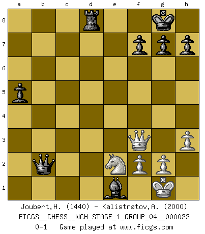 Last move : 0-1 2020 May 20 6:44:19 [Event "FICGS__CHESS__WCH_STAGE_1_GROUP_04__000022"] [Site "FICGS"] [Date "2020.03.01"] [Round "1"] [White "Joubert,Hennie"] [Black "Kalistratov,Aleksandr"] [Result "0-1"] [WhiteElo "1440"] [BlackElo "2000"] 1.d4 d5 2.c4 c6 3.Nc3 e6 4.Bf4 dxc4 5.e4 b5 6.a4 bxa4 7.Bxc4 Bb4 8.Nge2 a5 9.Qxa4 Ne7 10.O-O Ba6 11.Bxa6 Nxa6 12.Rfd1 O-O 13.d5 cxd5 14.exd5 exd5 15.Qb5 Nc7 16.Qd3 Re8 17.Bxc7 Qxc7 18.Nxd5 Nxd5 19.Qxd5 Rad8 20.Qf3 Qc2 21.Rxd8 Rxd8 22.h3 Qxb2 23.Re1 Bxe1 0-1 QGD Slav defense Kingside Castling by player White (move 10) Kingside Castling by player Black (move 12) Player Black won this chess game. Follow this game move after move (download)In Fischer's hands, a slight theoretical advantage is as good a being a Queen ahead. (Isaac Kashdan) Irgendwie scheint mir sonntags früh um 9 Uhr der Killerinstinkt verloren gegangen zu sein. (Alexej Shirov) La esencia del Ajedrez es pensar acerca de lo que el Ajedrez es. (David Bronstein) Même si l'adversaire joue le coup analysé précédemment, recommencez l'analyse en voyant la nouvelle position. Première règle de Blumenfeld A good aphorism is too hard for the tooth of time, and is not worn away with the centuries, although it serves as food for every speech. (Friedrich Nietzsche)