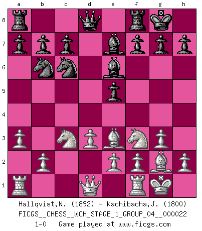 Last move : 1-0 2020 May 17 2:29:2 [Event "FICGS__CHESS__WCH_STAGE_1_GROUP_04__000022"] [Site "FICGS"] [Date "2020.03.01"] [Round "1"] [White "Hallqvist,Niklas"] [Black "Kachibacha,Jobadi"] [Result "1-0"] [WhiteElo "1892"] [BlackElo "1800"] 1.c4 e5 2.g3 Nf6 3.Bg2 d5 4.cxd5 Nxd5 5.Nf3 Nc6 6.Nc3 Nb6 7.a3 Be7 8.d3 Be6 9.O-O O-O 10.Be3 1-0 This chess game has been lost on time (started : 2020.03.01 23:43:35) English Opening Kingside Castling by player White (move 9) Kingside Castling by player Black (move 9) Player White won this chess game. Follow this game move after move (download)The defensive power of a pinned piece is only imaginary. (Aaron Nimzovich) Frage: Wie viele Autos haben Sie schon zerstört? - Antwort: Nur zwei. (Loek van Wely) Ciertamente, de todas la drogas del mundo, el Ajedrez debe ser el mas placentero permamentemente. (Assiac) Soyez une menace à chaque fois que vous vous asseyez pour jouer. (Ken Smith) Winning isn't everything... but losing is nothing. (Mednis)