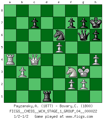 Last move : 1/2-1/2 2020 March 16 7:13:24 [Event "FICGS__CHESS__WCH_STAGE_1_GROUP_04__000022"] [Site "FICGS"] [Date "2020.03.01"] [Round "1"] [White "Payzansky,Aleksey"] [Black "Bovary,Charles"] [Result "1/2-1/2"] [WhiteElo "1877"] [BlackElo "1800"] 1.e4 e5 2.Nf3 Nc6 3.Bb5 a6 4.Ba4 Nf6 5.O-O Nxe4 6.d4 b5 7.Bb3 d5 8.dxe5 Be6 9.Nbd2 Nc5 10.c3 d4 11.Bxe6 Nxe6 12.cxd4 Ncxd4 13.a4 Nc6 14.Qe2 bxa4 15.Rxa4 Nb4 16.Qc4 Rb8 17.b3 Be7 18.Ba3 Nd5 19.Bxe7 Nxe7 20.Rfa1 O-O 21.Rxa6 Qd7 22.h4 h6 23.Ne4 Qb5 24.R1a3 Rfd8 25.R6a5 Qd7 26.Nc3 Qd3 27.Ra1 Qf5 28.R5a4 Rd3 29.Ra8 Rxa8 30.Rxa8+ Kh7 31.Ne2 Rd1+ 32.Kh2 Qb1 33.Ng3 Nf5 34.Ra4 Nxg3 35.Kxg3 Qg6+ 1/2-1/2 Ruy Lopez : Open, 7.Bb3 Kingside Castling by player White (move 5) Kingside Castling by player Black (move 20) This chess game ended in a draw. Follow this game move after move (download)In life, as in Chess, one's own Pawns block one's way. A man's very wealth, ease, leisure, children, books, which should help him to win, more often checkmate him. (Charles Buxton) Wenn Du nicht kämpfst, um anderen etwas zu beweisen, sondern nur für Dich selbst, dann bist du fast unbesiegbar. (Garry Kasparov) ¿Quién es tu oponente esta tarde? Esta tarde mi oponente son las piezas negras. (Akiba Rubinstein) J'apprécie les joueurs d'est-indienne, c'est grâce à eux que je nourris ma famille depuis tant d'années. (Petrosian) The ego is not master in its own house. (Sigmund Freud)