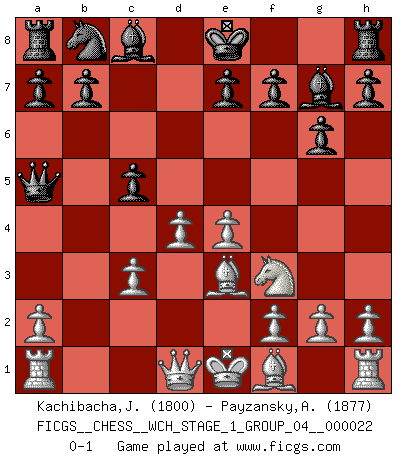 Last move : 0-1 2020 May 16 20:54:20 [Event "FICGS__CHESS__WCH_STAGE_1_GROUP_04__000022"] [Site "FICGS"] [Date "2020.03.01"] [Round "1"] [White "Kachibacha,Jobadi"] [Black "Payzansky,Aleksey"] [Result "0-1"] [WhiteElo "1800"] [BlackElo "1877"] 1.d4 Nf6 2.c4 g6 3.Nc3 d5 4.cxd5 Nxd5 5.e4 Nxc3 6.bxc3 Bg7 7.Nf3 c5 8.Be3 Qa5 0-1 King's Indian defense, 3.Nc3 Player Black won this chess game. Follow this game move after move (download)Let the perfectionist play postal. (Yasser Seirawan) Man wirke der falschen Auffassung entgegen, als ob jeder Zug Unmittelbares zu leisten habe; auch Werte- und Ruhezüge haben ihre Existenzberechtigung. (Aaron Nimzowitsch) El jugador táctico debe saber que hacer cuando algo se debe de hacer. El estratégico debe saber que hacer cuando nada se debe de hacer. (Savielly Tartakover) Une platitude souvent récitée à propos des Echecs est qu'une des choses les plus difficiles à réaliser est de gagner une position gagnante. Cela ne manque pas de sens mais, pour ma part, j'ai toujours trouvé plus difficile de gagner une position perdante. (Tim Krabbe) The only sure thing about luck is that it will change. (Wilson Mizner)