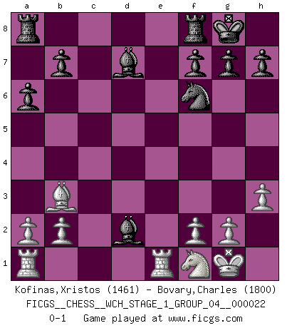 Last move : 0-1 2020 June 17 23:46:33 [Event "FICGS__CHESS__WCH_STAGE_1_GROUP_04__000022"] [Site "FICGS"] [Date "2020.03.01"] [Round "1"] [White "Kofinas,Xristos"] [Black "Bovary,Charles"] [Result "0-1"] [WhiteElo "1461"] [BlackElo "1800"] 1.e4 e5 2.Nf3 Nc6 3.Bc4 Nf6 4.d3 Bc5 5.c3 Bb6 6.O-O O-O 7.Nbd2 d6 8.h3 Na5 9.Bb5 a6 10.Ba4 c5 11.Re1 Nc6 12.Nf1 Bc7 13.d4 exd4 14.cxd4 Nxd4 15.Nxd4 cxd4 16.Qxd4 Bb6 17.Qd3 d5 18.exd5 Qxd5 19.Qb3 Qxb3 20.Bxb3 Bd7 21.Be3 Ba5 22.Bd2 Bxd2 0-1 This chess game has been lost on time (started : 2020.03.01 23:43:35) Two knights defense (Modern Bishop's Opening) Kingside Castling by player White (move 6) Kingside Castling by player Black (move 6) Player Black won this chess game. Follow this game move after move (download)Chess books should be used as we use glasses: to assist the sight, although some players make use of them as if they thought they conferred sight. (Jose Raul Capablanca) Oft bringt ein stiller Zug das Erdbeben. (Richard Reti) La belleza de un movimiento no se refleja solo en su apariencia, sino en el pensamiento detrás de él. (Siegbert Tarrasch) Un journaliste : 'Vous préférez avoir une dame de plus sur l'échiquier ou au lit ?' Boris Spassky : 'Ca dépend de la position.' . 'gn is not allowed in chess unless n is an integer between 1 and 8 inclusive, where 1 and 8 are to interpreted as the standard numerals standing for integers in the ordered real-closed field R, with the *canonical* ordering. (As opposed to, say, an integer in the domain Z[2+i*sqrt(5)] or an integer in some exotic Grothendieck topos). (Normajean Yates)