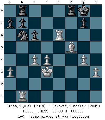 Last move : 1-0 2006 December 8 13:46:41 [Event "FICGS__CHESS__CLASS_A__000005"] [Site "FICGS"] [Date "2006.06.20"] [Round "1"] [White "Pires,Miguel"] [Black "Rakovic,Miroslav"] [Result "1-0"] [WhiteElo "2014"] [BlackElo "2045"] 1.e4 e6 2.d4 d5 3.Nc3 Bb4 4.a3 Bxc3+ 5.bxc3 dxe4 6.f3 e5 7.Be3 exd4 8.cxd4 Nh6 9.fxe4 Qh4+ 10.Kd2 Qxe4 11.Qf3 Qxf3 12.Nxf3 Nf5 13.Bf4 c6 14.Bd3 O-O 15.g4 Ne7 16.Bd6 Re8 17.Rae1 Be6 18.Ng5 Ng6 19.Bf5 Nf8 20.Bxf8 Rxf8 21.Bxh7+ Kh8 22.Bd3 Nd7 23.Nxe6 fxe6 24.Rxe6 Nf6 25.Rb1 Rab8 26.h3 Nd5 27.Bf5 Kg8 28.c4 Nb6 29.Kd3 1-0 French : Winawer (Nimzovich) variation Kingside Castling by player Black (move 14) Player White won this chess game. Follow this game move after move (download)Who is your opponent tonight, tonight I am playing against the Black pieces. (Akiba Rubinstein) Ein Schachspiel besteht aus drei Phasen: Die erste, wenn du hofftst den Vorteil zu haben, die zweite, wenn du glaubst einen Vorteil zu haben, und die dritte.... wenn du weißt Du wirst verlieren. (Savielly Grigorievitsch Tartakower) a manera como él juega al Ajedrez, demuestra la completa naturaleza de un hombre. (Stanley Ellin) Les échecs sont plus proches de l'art de l'assassinat que de l'art de la guerre. (Arturo Perez-Reverte) The meaning of life is that it is to be lived, and it is not to be traded and conceptualized and squeezed into a pattern of systems. (Bruce Lee)