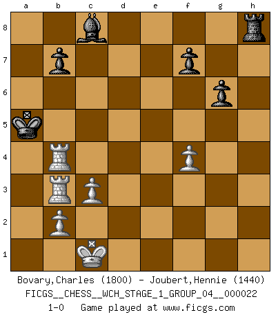 Last move : 1-0 2020 April 3 18:4:33 [Event "FICGS__CHESS__WCH_STAGE_1_GROUP_04__000022"] [Site "FICGS"] [Date "2020.03.01"] [Round "1"] [White "Bovary,Charles"] [Black "Joubert,Hennie"] [Result "1-0"] [WhiteElo "1800"] [BlackElo "1440"] 1.e4 c5 2.Nf3 e6 3.d4 cxd4 4.Nxd4 Nf6 5.Nc3 d6 6.g4 h6 7.Rg1 Nc6 8.h4 d5 9.exd5 Nxd5 10.Nxd5 exd5 11.Be3 Be7 12.g5 hxg5 13.hxg5 g6 14.c3 Rh5 15.Qd2 Bh3 16.Be2 Rh4 17.O-O-O Qd7 18.Rh1 O-O-O 19.Bb5 Rdh8 20.Rhe1 a6 21.Nxc6 axb5 22.Nxe7+ Qxe7 23.Bd4 Rxd4 24.Qxd4 Qxg5+ 25.f4 Qd8 26.Qc5+ Kb8 27.Rxd5 Qf6 28.Rd4 Rc8 29.Qe5+ Qxe5 30.Rxe5 Be6 31.Rxb5 Rh8 32.Rdb4 Bc8 33.a4 Ka7 34.a5 Ka6 35.Rb6+ Kxa5 36.R4b5+ Ka4 37.Rb3 Ka5 38.R6b4 1-0 Sicilian : Anderssen variation Queenside Castling by player White (move 17) Queenside Castling by player Black (move 18) Player White won this chess game. Follow this game move after move (download)The mistakes are there, waiting to be made. (Savielly Tartakower) Wenn du nicht weißt was du tun sollst, warte bis dein Gegner eine Idee hat. Sie wird sicher schlecht sein. (Siegbert Tarrasch) Los Peones son nacidos libres, y aún así, se encuentran por doquier encadenados. (Rick Kennedy) Les échecs, c'est la lutte contre l'erreur. (Johannes Zukertort) Thibault, I ask for draw. Game 13876. - Sorry Ilmars, you won. (FICGS chat)
