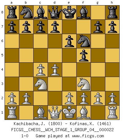 Last move : 1-0 2020 May 30 18:19:24 [Event "FICGS__CHESS__WCH_STAGE_1_GROUP_04__000022"] [Site "FICGS"] [Date "2020.03.01"] [Round "1"] [White "Kachibacha,Jobadi"] [Black "Kofinas,Xristos"] [Result "1-0"] [WhiteElo "1800"] [BlackElo "1461"] 1.c4 e6 2.Nc3 f5 3.d4 Nf6 4.Nf3 1-0 This chess game has been lost on time (started : 2020.03.01 23:43:35) English Opening Player White won this chess game. Follow this game move after move (download)Via the squares on the chessboard, the Indians explain the movement of time and the age, the higher influences which control the world and the ties which link Chess with the human soul. (Al-Masudi) Ich hatte Zahnschmerzen im ersten Spiel. In der zweiten Partie tat mir der Kopf weh. In der dritten war es eine Rheuma-Attacke und während der vierten fühlte ich mich nicht gut. Und in der fünften? Nun, man muss doch nicht jedes Spiel gewinnen, oder? (Savielly Grigorievitsch Tartakower) Me siento como si fuera una pieza en una partida de Ajedrez, cuando mi oponente me indica: esa pieza no puede ser movida. (Soren Kierkegaard) Le génie consiste à savoir transgresser les règles au moment opportun. (Teichmann) Industry executives and analysts often mistakenly talk about strategy as if it were some kind of chess match. But in chess, you have just two opponents, each with identical resources, and with luck playing a minimal role. The real world is much more like a poker game, with multiple players trying to make the best of whatever hand fortune has dealt them. In our industry, Bill Gates owns the table until someone proves otherwise. (David Moschella, 'Computerworld')