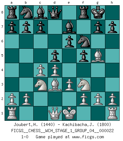 Last move : 1-0 2020 May 17 2:29:2 [Event "FICGS__CHESS__WCH_STAGE_1_GROUP_04__000022"] [Site "FICGS"] [Date "2020.03.01"] [Round "1"] [White "Joubert,Hennie"] [Black "Kachibacha,Jobadi"] [Result "1-0"] [WhiteElo "1440"] [BlackElo "1800"] 1.d4 f5 2.c4 Nf6 3.Nc3 e6 4.Bg5 Be7 5.Nf3 O-O 6.e3 d5 7.Bd3 1-0 This chess game has been lost on time (started : 2020.03.01 23:43:35) Dutch with c4 & Nc3 Kingside Castling by player Black (move 5) Player White won this chess game. Follow this game move after move (download)Do you realize Fischer almost never has any bad pieces? He exchanges them, and the bad pieces remain with his opponents. (Yuri Balashov) Wenn Spassky eine Figur opfert kannst du genauso gut aufgeben. Aber wenn Tal eine Figur opfert, spiel weiter. Er könnte noch eine weitere opfern, und dann ... wer weiß? (Miguel Najdorf) Yo tuve un dolor de muelas en la primer partida. En el segundo juego, tuve un dolor de cabeza. En el tercero, tuve un ataque de reumatísmo. En la cuarta partida, no me sentía muy bien. ¿Y en el quinto juego? Bueno, ¿que acaso uno tiene que ganar todos los juegos?. (Siegbert Tarrasch) Même un GMI sait rarement calculer sur plus de cinq coups une attaque à sacrifices. (Rudolf Spielmann) This is where the fun begins. (Anakin Skywalker in Star Wars ep.3)