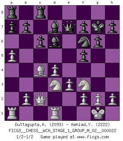 Last move : 1/2-1/2 2020 April 9 8:9:17 [Event "FICGS__CHESS__WCH_STAGE_1_GROUP_M_02__000022"] [Site "FICGS"] [Date "2020.03.01"] [Round "1"] [White "Duttagupta,Aniruddha"] [Black "Aahlad,Yeturu"] [Result "1/2-1/2"] [WhiteElo "2093"] [BlackElo "2222"] 1.d4 Nf6 2.Bg5 d5 3.Bxf6 exf6 4.e3 Bd6 5.c4 dxc4 6.Bxc4 O-O 7.Nc3 c6 8.Nf3 f5 9.Qc2 Nd7 10.O-O g6 11.Rfd1 Nf6 12.a4 Qe7 13.a5 Kg7 14.Ne2 Bd7 15.Nf4 Rfc8 16.Nd3 1/2-1/2 Trompowsky attack (Ruth, Opovcensky Opening) Kingside Castling by player Black (move 6) Kingside Castling by player White (move 10) This chess game ended in a draw. Follow this game move after move (download)Fischer prefers to enter Chess history alone. (Miguel Najdorf) Am wohlsten fühle ich mich, wenn ich sehe, wie sich mein Gegner im Todeskampf windet. (Robert James Fischer) Las leyes del Ajedrez no permiten una libre elección: tienes que mover quieras o no. (Emanuel Lasker) Avant la finale, les dieux ont créé le milieu de partie. (Tarrasch) The only thing that overcomes hard luck is hard work. (Harry Golden)