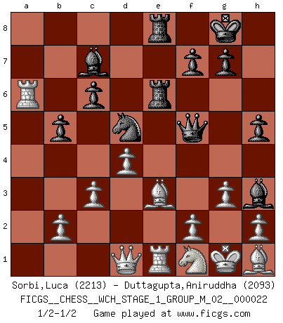 Last move : 1/2-1/2 2020 May 17 7:0:40 [Event "FICGS__CHESS__WCH_STAGE_1_GROUP_M_02__000022"] [Site "FICGS"] [Date "2020.03.01"] [Round "1"] [White "Sorbi,Luca"] [Black "Duttagupta,Aniruddha"] [Result "1/2-1/2"] [WhiteElo "2213"] [BlackElo "2093"] 1.e4 e5 2.Nf3 Nc6 3.Bb5 a6 4.Ba4 Nf6 5.O-O Be7 6.Re1 b5 7.Bb3 O-O 8.c3 d5 9.exd5 Nxd5 10.Nxe5 Nxe5 11.Rxe5 c6 12.d4 Bd6 13.Re1 Qh4 14.g3 Qh3 15.Be3 Bg4 16.Qd3 Rae8 17.Nd2 Qh5 18.a4 Re6 19.axb5 axb5 20.Nf1 Bf5 21.Qd2 Bh3 22.Bd1 Qg6 23.Bf3 Qf5 24.Qd1 h5 25.Ra6 Bc7 26.Bh1 Rfe8 1/2-1/2 Ruy Lopez : Closed, 7...O-O Kingside Castling by player White (move 5) Kingside Castling by player Black (move 7) This chess game ended in a draw. Follow this game move after move (download)When I have White, I win because I am white; When I have Black, I win because I am Bogolyubov. (Bogolyubov) Der Traum, für den ich lebe, ist der von einem freien Russland. Viele mögen sagen: Russland hat doch ein Parlament, einen gewählten Präsidenten. Aber ich spüre, dass in meiner Heimat die Angst wiederkehrt. Eine Angst, sich frei zu äußern, bestimmte Dinge zu tun (Garry Kasparov) Yo jugué Ajedrez con el y a veces le pude haber ganado solo que siempre devuelve su última jugada y juega la partida de manera diferente. (Mark Twain) Les Echecs sont et restent toujours un combat, un combat intégral comme la boxe, la lutte ou un autre sport, et où il doit y avoir un vainqueur et un vaincu. (Joseph Emil Diemer) To steal ideas from one person is plagiarism. To steal from many is research. (Unknown)