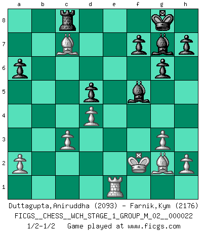 Last move : 1/2-1/2 2020 April 11 11:31:54 [Event "FICGS__CHESS__WCH_STAGE_1_GROUP_M_02__000022"] [Site "FICGS"] [Date "2020.03.01"] [Round "1"] [White "Duttagupta,Aniruddha"] [Black "Farnik,Kym"] [Result "1/2-1/2"] [WhiteElo "2093"] [BlackElo "2176"] 1.d4 Nf6 2.c4 g6 3.g3 c6 4.Nf3 Bg7 5.Bg2 O-O 6.Nc3 d5 7.cxd5 cxd5 8.Ne5 Bf5 9.O-O Ne4 10.Bf4 Nxc3 11.bxc3 Nc6 12.Nxc6 bxc6 13.Qa4 Qb6 14.e4 dxe4 15.Rab1 Qd8 16.Rb7 a6 17.Re1 e6 18.Qxc6 Rc8 19.Rc7 Rxc7 20.Bxc7 Qd5 21.Qxd5 exd5 22.Rb1 e3 23.Re1 exf2+ 24.Kxf2 Rc8 1/2-1/2 King's Indian : 3.g3 Kingside Castling by player Black (move 5) Kingside Castling by player White (move 9) This chess game ended in a draw. Follow this game move after move (download)You may learn much more from a game you lose than from a game you win. You will have to lose hundreds of games before becoming a good player. (Jose Raul Capablanca) Konzentriere dich auf materielle Gewinne. Nimm, was dir dein Gegner gibt, ausser es gibt einen guten Grund der dagegenspricht. (Robert James Fischer) Los libros de Ajedrez deben de usarse igual como usamos los anteojos: para mejorar la vista, aunque algunos jugadores los quieren usar como si ellos les otorgaran la vision. (José Raúl Capablanca) On n'a jamais que l'âge auquel on a commence à jouer aux échecs car après on cesse de vieillir. (Capablanca) The Internet isn't free. It just has an economy that makes no sense to capitalism. (Brad Shapcott)
