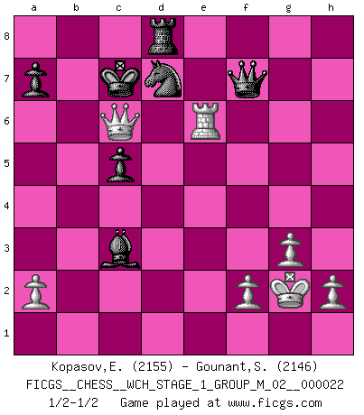 Last move : 1/2-1/2 2020 April 22 17:51:56 [Event "FICGS__CHESS__WCH_STAGE_1_GROUP_M_02__000022"] [Site "FICGS"] [Date "2020.03.01"] [Round "1"] [White "Kopasov,Evgeny"] [Black "Gounant,Stanislas"] [Result "1/2-1/2"] [WhiteElo "2155"] [BlackElo "2146"] 1.d4 d5 2.c4 c6 3.Nc3 Nf6 4.Nf3 e6 5.Bg5 dxc4 6.e4 b5 7.e5 h6 8.Bh4 g5 9.Nxg5 hxg5 10.Bxg5 Nbd7 11.exf6 Bb7 12.g3 Qb6 13.Bg2 O-O-O 14.O-O c5 15.d5 b4 16.Re1 bxc3 17.bxc3 exd5 18.Rb1 Qc6 19.Rxb7 Qxb7 20.Bxd5 Qb6 21.Qf3 Bh6 22.Bh4 Kc7 23.Bxf7 Bd2 24.Re7 Qb1+ 25.Kg2 Qd3 26.Qg4 Qd6 27.Qxc4 Rxh4 28.Qxh4 Bxc3 29.Qe4 Qxf6 30.Re6 Qxf7 31.Qc6+ 1/2-1/2 QGD Slav defense Queenside Castling by player Black (move 13) Kingside Castling by player White (move 14) This chess game ended in a draw. Follow this game move after move (download)I thought the most common mistake [in chess] was the first one: Learning the game :P (Garvin Gray, FICGS forum) Als er Schachweltmeister wurde ließ er praktisch alle stärksten Sovietspieler für sich arbeiten. Wenn ein auch nur mittelmässiger Meister ein Spezialist für eine bestimmte Eröffnung war, wurde er von Karpov gerufen. Das wurde alles geheim gehalten. (Mikhail Moiseyevich Botvinik) El Ajedrez no es una pizca de inferior al violín, y tenemos un gran número de violinistas profesionales. (Mikhail Botvinnik) La menace est plus forte que l'exécution. (Aaron Nimzovitch) If I had no sense of humor, I would long ago have committed suicide. (Mahatma Gandhi)