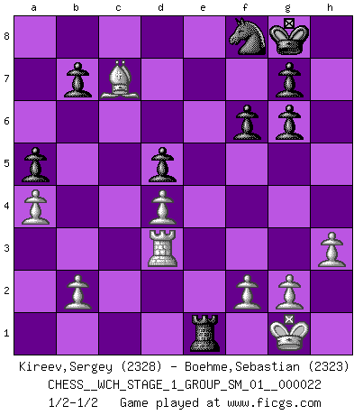 Last move : 1/2-1/2 2020 March 30 20:27:14 [Event "FICGS__CHESS__WCH_STAGE_1_GROUP_SM_01__000022"] [Site "FICGS"] [Date "2020.03.01"] [Round "1"] [White "Kireev,Sergey"] [Black "Boehme,Sebastian"] [Result "1/2-1/2"] [WhiteElo "2328"] [BlackElo "2323"] 1.e4 e5 2.Nf3 Nc6 3.Bc4 Nf6 4.d3 Bc5 5.c3 a5 6.O-O Ba7 7.Re1 d6 8.Nbd2 O-O 9.h3 Be6 10.Bb5 Ne7 11.d4 Ng6 12.Ba4 Nh5 13.Nf1 Nhf4 14.Bc2 Qd7 15.Ne3 exd4 16.cxd4 d5 17.exd5 Nxd5 18.Bd2 Nxe3 19.Bxe3 Rfd8 20.Qd3 c6 21.Rad1 Bb8 22.Bg5 Re8 23.Bd2 Bc7 24.Ne5 Qd5 25.a4 Nf8 26.Bf4 f6 27.Ng6 hxg6 28.Bxc7 Bf5 29.Rxe8 Rxe8 30.Bb3 Bxd3 31.Bxd5+ cxd5 32.Rxd3 Re1+ 1/2-1/2 Two knights defense (Modern Bishop's Opening) Kingside Castling by player White (move 6) Kingside Castling by player Black (move 8) This chess game ended in a draw. Follow this game move after move (download)The way he plays Chess demonstrates a man's whole nature. (Stanley Ellin) Schach ist ein Reich, wo sich die menschliche Phantasie frei entfalten kann. (David Bronstein) Fischer es una tragedia del Ajedrez Americano a la par con Morphy y Pillsbury. (Mig Greengard) Même si vous avez un bon coup à faire, regardez toujours s'il n'y en a pas un qui lui soit préférable. (Pedro Damiano) If only people were all showed a certain minimum level of niceness; if only people didn't retract verbal draw offers (without draw box ticked) on ficgs; if only people didn't kill; if only people didn't run concentration / extermination camps, if only people didn't drop nuclear bombs on Hiroshima and Nagasaki, and so on - it would be a much more beautiful world. But sadly, things are not so... (Normajean Yates)