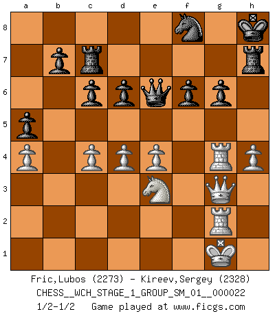 Last move : 1/2-1/2 2020 April 15 20:1:29 [Event "FICGS__CHESS__WCH_STAGE_1_GROUP_SM_01__000022"] [Site "FICGS"] [Date "2020.03.01"] [Round "1"] [White "Fric,Lubos"] [Black "Kireev,Sergey"] [Result "1/2-1/2"] [WhiteElo "2273"] [BlackElo "2328"] 1.e4 e5 2.Nf3 Nc6 3.Bc4 Bc5 4.c3 Nf6 5.d3 d6 6.O-O O-O 7.h3 a5 8.a4 h6 9.Re1 Be6 10.Nbd2 Bxc4 11.Nxc4 Re8 12.Be3 Bxe3 13.Nxe3 Qd7 14.Nh4 Ne7 15.Qf3 Qe6 16.Nhf5 Nxf5 17.Nxf5 Kh7 18.Ne3 g6 19.Qe2 Kg7 20.Qd2 h5 21.c4 c6 22.Rad1 Re7 23.b3 Nd7 24.Rf1 f6 25.f4 exf4 26.Rxf4 Nc5 27.Rdf1 Rf7 28.g4 Rh8 29.h4 Nxb3 30.Qg2 Nc5 31.gxh5 Rxh5 32.d4 Nd7 33.Rg4 Nf8 34.Qg3 Kh8 35.Rf2 R5h7 36.Rg2 Rc7 1/2-1/2 Giuoco Piano Kingside Castling by player White (move 6) Kingside Castling by player Black (move 6) This chess game ended in a draw. Follow this game move after move (download)A bad day of Chess is better than any good day at work. (Anonymous) Ihnen, Herr Lasker, habe ich nur drei Worte zu sagen: Schach und matt. (Siegbert Tarrasch) Un mal día en el Ajedrez, es mejor que cualquier buen día en el trabajo. (Anonymous) Les échecs sont utiles à l'exercice de la faculté de penser et à celle de l'imagination. Car nous devons posséder une méthode élaborée pour atteindre des buts partout où nous devons conduire notre raison. (Leibnitz) Gambling : The sure way of getting nothing from something. (Wilson Mizner)