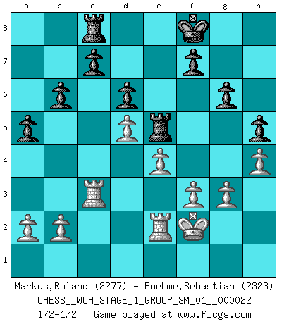 Last move : 1/2-1/2 2020 April 11 13:25:26 [Event "FICGS__CHESS__WCH_STAGE_1_GROUP_SM_01__000022"] [Site "FICGS"] [Date "2020.03.01"] [Round "1"] [White "Markus,Roland"] [Black "Boehme,Sebastian"] [Result "1/2-1/2"] [WhiteElo "2277"] [BlackElo "2323"] 1.d4 Nf6 2.Nf3 g6 3.c4 Bg7 4.Nc3 d6 5.e4 O-O 6.Be2 e5 7.O-O exd4 8.Nxd4 Re8 9.f3 Nc6 10.Be3 Nh5 11.Qd2 Nxd4 12.Bxd4 Nf4 13.Rad1 Bxd4+ 14.Qxd4 Qg5 15.g3 Nxe2+ 16.Nxe2 b6 17.h4 Qc5 18.Nc3 Bb7 19.Kf2 h5 20.Rfe1 a5 21.Re3 Qxd4 22.Rxd4 Kg7 23.Nd5 Rac8 24.Rd2 Bxd5 25.cxd5 Re5 26.Rc3 Kf8 27.Re2 1/2-1/2 King's Indian : East Indian defense Kingside Castling by player Black (move 5) Kingside Castling by player White (move 7) This chess game ended in a draw. Follow this game move after move (download)Fischer is an American Chess tragedy on par with Morphy and Pillsbury. (Mig Greengard) Schach ist wie eine schöne Frau, zu der wir ständig zurückkehren, gleichviel, wie oft sie uns zurückweist. (Anonymous) Es muy difícil jugar en contra de la teoría de Einstein. - en su primera derrota en contra de Fischer (Mikhail Tal) C'est la seule position que je connaisse où les deux camps sont mals. Propos prêtés à V. Anand. I would love to change the world, but they won't give me the source code. (Unknown)