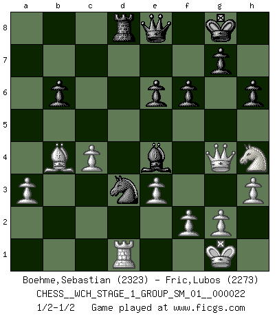 Last move : 1/2-1/2 2020 May 2 21:53:10 [Event "FICGS__CHESS__WCH_STAGE_1_GROUP_SM_01__000022"] [Site "FICGS"] [Date "2020.03.01"] [Round "1"] [White "Boehme,Sebastian"] [Black "Fric,Lubos"] [Result "1/2-1/2"] [WhiteElo "2323"] [BlackElo "2273"] 1.d4 Nf6 2.c4 e6 3.Nc3 Bb4 4.Qc2 O-O 5.Nf3 d5 6.e3 b6 7.a3 Bxc3+ 8.Qxc3 Bb7 9.b3 c5 10.dxc5 Nbd7 11.cxb6 Ne4 12.Qc2 dxc4 13.bxc4 Ndc5 14.Be2 Qf6 15.Ra2 axb6 16.O-O Nc3 17.Bb2 Nxe2+ 18.Qxe2 Qg6 19.Bd4 h6 20.h3 Rfe8 21.Kh2 Na4 22.Rg1 f6 23.Nh4 Qf7 24.Rc1 Red8 25.Rd2 Qc7+ 26.Kg1 Rac8 27.Qd1 Ra8 28.Qg4 Qf7 29.Qd1 Qe8 30.Bc3 Be4 31.Bb4 Nc5 32.Rxd8 Rxd8 33.Qg4 Nd3 34.Rd1 1/2-1/2 Nimzo-Indian : Classical variation Kingside Castling by player Black (move 4) Kingside Castling by player White (move 16) This chess game ended in a draw. Follow this game move after move (download)Place the contents of the Chess box in a hat, shake them up vigorously, pour them on the board from a height of two feet, and you get the style of Steinitz. (H. E. Bird) Es genügt nicht ein guter Spieler zu sein, man muß auch gut spielen. (Siegbert Tarrasch) La mitad de las variaciones que son calculadas en una partida de torneo, resultan ser completamente superfluas. Desafortunadamente, nadie sabe por adelantado cual mitad. (Jan Tinman) Les échecs, c'est l'art d'analyser. (Mikhail Botvinnik) Live, lose, and learn, by observing your opponent how to win. (Amber Steenbock)