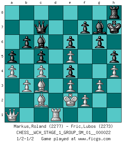 Last move : 1/2-1/2 2020 May 13 20:48:49 [Event "FICGS__CHESS__WCH_STAGE_1_GROUP_SM_01__000022"] [Site "FICGS"] [Date "2020.03.01"] [Round "1"] [White "Markus,Roland"] [Black "Fric,Lubos"] [Result "1/2-1/2"] [WhiteElo "2277"] [BlackElo "2273"] 1.d4 Nf6 2.Nf3 d5 3.e3 e6 4.Bd3 b6 5.b3 c5 6.O-O Bb7 7.Bb2 Be7 8.Nbd2 O-O 9.Ne5 Nc6 10.a3 Nxe5 11.dxe5 Ne4 12.Nxe4 dxe4 13.Be2 Qc7 14.c4 a5 15.a4 g6 16.Qb1 Rfd8 17.Bd1 Bf8 18.Bc2 Qc6 19.Qa2 Bg7 20.Rad1 Qc7 21.Qa1 h5 22.h3 Rac8 23.Bc3 Kf8 24.g3 Rxd1 25.Rxd1 Kg8 26.h4 Kh7 27.Kf1 Bc6 28.Ke2 Rd8 29.Rg1 Rh8 30.Kd2 Kg8 31.Rd1 Kf8 32.Ke2 Kg8 33.Kd2 Kf8 34.Ke1 Kg8 35.Ke2 Kh7 1/2-1/2 Queen's pawn game Kingside Castling by player White (move 6) Kingside Castling by player Black (move 8) This chess game ended in a draw. Follow this game move after move (download)Chess is played with the mind and not with the hands ! (Renaud and Kahn) Spielt Blackmar-Diemer-Gambit, und das Matt kommt von selbst! (Emil Joseph Diemer) No solamente yo pronostico su triunfo sobre Botvinnik, sino que me adelanto y digo que probablemente Fischer es el jugador de Ajedrez mas grande que haya existido. (John Collins) Les écrivains ont utilisé les échecs pour analyser les côtés extrêmes de la nature humaine. Dans ce cadre, les échecs offrent un champ d'expérimentation idéal. Mais on pourrait faire la même chose avec la peinture. Et là, en vous référant à Van Gogh, vous ne tirerez pas de conclusion définitive sur les peintres. (Gary Kasparov) Horse racing is animated roulette. (Roger Kahn)