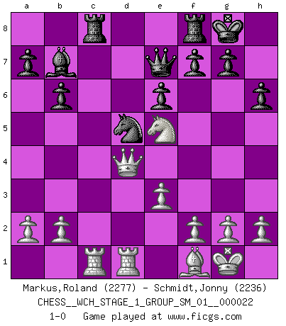 Last move : 1-0 2020 May 11 5:12:47 [Event "FICGS__CHESS__WCH_STAGE_1_GROUP_SM_01__000022"] [Site "FICGS"] [Date "2020.03.01"] [Round "1"] [White "Markus,Roland"] [Black "Schmidt,Jonny"] [Result "1-0"] [WhiteElo "2277"] [BlackElo "2236"] 1.d4 d5 2.Nf3 Nf6 3.e3 c5 4.c3 Nbd7 5.c4 cxd4 6.cxd5 Nxd5 7.Qxd4 e6 8.Be2 Nb4 9.Qc3 Nd5 10.Qc2 Bb4+ 11.Bd2 Bxd2+ 12.Qxd2 N7f6 13.O-O O-O 14.Nc3 b6 15.Nxd5 Nxd5 16.Rfd1 Bb7 17.Rac1 Rc8 18.Qd4 h6 19.Ne5 Qe7 20.Bf1 1-0 This chess game has been lost on time (started : 2020.03.01 23:46:7) Queen's pawn game Kingside Castling by player White (move 13) Kingside Castling by player Black (move 13) Player White won this chess game. Follow this game move after move (download)Fischer Chess play was always razor-sharp, rational and brilliant. One of the best ever. (Dave Regis) Konzentriere dich auf materielle Gewinne. Nimm, was dir dein Gegner gibt, ausser es gibt einen guten Grund der dagegenspricht. (Robert James Fischer) Estaba muy claro de que el punto vulnerable del Gran Maestro Americano (Bobby Fischer) radicaba en las posiciones de doble filo, colgantes, irracionales, donde el siempre falló en encontrar un triunfo aún en una posición de clara victoria. (Efim Geller) L'attaque fait le spectacle, la défense gagne les matchs. (Dicton footballistique) When a man with money meets a man with experience, the man with experience leaves with money and the man with money leaves with experience. (Anonymous)