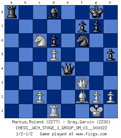Last move : 1/2-1/2 2020 May 8 15:1:47 [Event "FICGS__CHESS__WCH_STAGE_1_GROUP_SM_01__000022"] [Site "FICGS"] [Date "2020.03.01"] [Round "1"] [White "Markus,Roland"] [Black "Gray,Garvin"] [Result "1/2-1/2"] [WhiteElo "2277"] [BlackElo "2230"] 1.e4 c5 2.Nf3 d6 3.d4 cxd4 4.Nxd4 Nf6 5.Nc3 a6 6.Be3 e5 7.Nb3 Be6 8.f3 Nbd7 9.Qd2 h5 10.Nd5 Nxd5 11.exd5 Bf5 12.Na5 Rb8 13.a4 Be7 14.Nc4 b6 15.Bd3 Bxd3 16.Qxd3 O-O 17.O-O Qc7 18.Bf2 Rfc8 19.b3 Nf6 20.Rfc1 b5 21.axb5 axb5 22.Na5 Ra8 23.Qxb5 Qc3 24.b4 e4 25.Qe2 Bd8 26.Rd1 exf3 27.Qxf3 Qxb4 28.Nc6 Qe4 29.Rxa8 Rxa8 1/2-1/2 Sicilian : Najdorf, Byrne (English) attack Kingside Castling by player Black (move 16) Kingside Castling by player White (move 17) This chess game ended in a draw. Follow this game move after move (download)What is the object of playing a gambit opening?... To acquire a reputation of being a dashing player at the cost of losing a game. (Siegbert Tarrasch) Ich suche im Schach immer etwas Eigenes. Riskantes Spiel im Stile schachlicher Musketiere ist nicht meine Sache, auch wenn es vielen Freunden scharfer Wendungen gefällt. (Anatoly Karpov) Si yo gano un torneo, yo lo gano por mí mismo. Yo hago las jugadas. Nadie me ayuda. (Bobby Fischer) Le profane ne songe pas à la somme de jouissance dont il se prive, qui méconnaît ce jeu aux ressources aussi variées que passionnantes. (Jean-Marie Jeanton-Lamarche) Being number two sucks. (Andre Agassi)