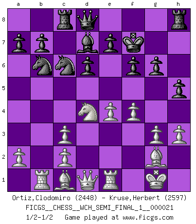 Last move : 1/2-1/2 2020 March 17 13:41:41 [Event "FICGS__CHESS__WCH_SEMI_FINAL_1__000021"] [Site "FICGS"] [Date "2020.03.02"] [Round "2"] [White "Ortiz,Clodomiro"] [Black "Kruse,Herbert"] [Result "1/2-1/2"] [WhiteElo "2448"] [BlackElo "2597"] 1.Nf3 Nf6 2.g3 c5 3.Bg2 Nc6 4.d4 cxd4 5.Nxd4 h5 6.Nc3 g6 7.e4 Bg7 8.Nf3 d6 9.O-O Nd7 10.Rb1 Bxc3 11.bxc3 Nb6 12.Nd4 Bd7 13.h3 Rc8 14.Re1 f6 15.f4 Kf7 1/2-1/2 Reti Opening Kingside Castling by player White (move 9) This chess game ended in a draw. Follow this game move after move (download)Chess is everything: art, science and sport. (Anatoly Karpov) Im Leben werden Partien nie so unstrittig gewonnen wie im Spiel (Emanuel Lasker) Por esta medida (el intervalo entre Fischer y sus contemporaneos), yo le considero el mas grande campeón mundial. (Garry Kasparov) L'action d'une oeuvre littéraire se déroule sur un champ de bataille. Les masques et les types du drame moderne correspondent aux pièces du jeu d'échecs. L'intrigue correspond aux coups et aux gambits, c'est à dire aux techniques du jeu telles qu'utilisées et interprétées par les joueurs. Les tactiques et les péripéties [mouvements] correspondent aux coups exécutés par l'adversaire. (Viktor Shklovsky) It's not the will to win, but the will to prepare to win that makes the difference. (Bear Bryant)
