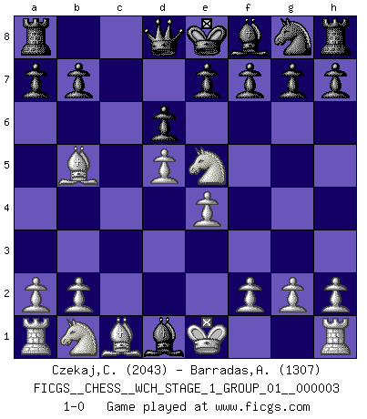 Last move : 1-0 2007 August 23 0:2:21 [Event "FICGS__CHESS__WCH_STAGE_1_GROUP_01__000003"] [Site "FICGS"] [Date "2007.07.11"] [Round "1"] [White "Czekaj,Christophe"] [Black "Barradas,Anderson"] [Result "1-0"] [WhiteElo "2043"] [BlackElo "1307"] 1.e4 c5 2.Nf3 d6 3.c3 Nc6 4.d4 cxd4 5.cxd4 Bg4 6.d5 Ne5 7.Nxe5 Bxd1 8.Bb5+ 1-0 Sicilian Player White won this chess game. Follow this game move after move (download)A sacrifice is best refuted by accepting it. (Wilhelm Steinitz) Es ist wirklich schade, dass so viele Schachspieler nicht auf ihr Äußeres achten! (Alexandra Kosteniuk) Coloca el contenido del tablero de Ajedrez en un sombrero, agita las piezas vigorosamente, derrámalas en el tablero desde una altura de medio metro y así obtienes el estilo de Wilhelm Steinitz. (H. E. Bird) D'abord les bases : Jouez et étudiez, puis étudiez et jouez, ensuite jouez et étudiez, puis étudiez et jouez. Deuxièmement : Donnez toujours le meilleur de vous-même ! (Ken Smith) Optimism is a variety of information deficit. Sometimes especially true for correspondence chess games. (Michael Aigner)