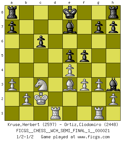 Last move : 1/2-1/2 2020 March 17 13:46:59 [Event "FICGS__CHESS__WCH_SEMI_FINAL_1__000021"] [Site "FICGS"] [Date "2020.03.02"] [Round "7"] [White "Kruse,Herbert"] [Black "Ortiz,Clodomiro"] [Result "1/2-1/2"] [WhiteElo "2597"] [BlackElo "2448"] 1.Nf3 Nf6 2.g3 c5 3.Bg2 Nc6 4.c4 d5 5.cxd5 Nxd5 6.d4 cxd4 7.Nxd4 Ndb4 8.Nxc6 Qxd1+ 9.Kxd1 Nxc6 10.Nc3 Bf5 11.Bxc6+ bxc6 12.f3 e5 13.e4 Be6 14.Be3 Bb4 15.Kc2 Bh3 16.Rhg1 f5 17.a3 Be7 18.Rad1 1/2-1/2 Reti Opening This chess game ended in a draw. Follow this game move after move (download)My style is somewhere between that of Tal and Petrosian. (Reshevsky) Moralische Siege zählen nicht. (Savielly Grigorievitsch Tartakower) Desconfianza es la característica mas necesaria de un jugador de Ajedrez. (Siegbert Tarrasch) Nous vivons dans un monde échiquéen : chaque jour qui passe est un défi à relever. (Philosophe Sasha) The problem with manipulation is that people can turn on you. (Horatio Caine, C.S.I. Miami)