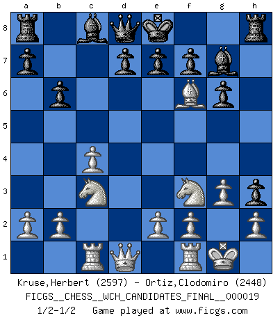 Last move : 1/2-1/2 2020 March 17 16:24:21 [Event "FICGS__CHESS__WCH_CANDIDATES_FINAL__000019"] [Site "FICGS"] [Date "2020.03.02"] [Round "3"] [White "Kruse,Herbert"] [Black "Ortiz,Clodomiro"] [Result "1/2-1/2"] [WhiteElo "2597"] [BlackElo "2448"] 1.Nf3 Nf6 2.g3 c5 3.Bg2 Nc6 4.d4 cxd4 5.Nxd4 h5 6.c4 h4 7.Nc3 g6 8.Bg5 h3 9.Bf3 Bg7 10.O-O Ne5 11.Rc1 Nxf3+ 12.Nxf3 b6 13.Bxf6 1/2-1/2 Reti Opening Kingside Castling by player White (move 10) This chess game ended in a draw. Follow this game move after move (download)He who takes the Queen's Knight's Pawn will sleep in the streets. (Anonymous) Du weisst es gibt ein Problem mit Computern und Fernschach, wenn jeder eine Rating von 2450 hat. (John Christen Knudsen) Aquel que teme a un Peón de Reina aislado, debería de retirarse del Ajedrez. (Siegbert Tarrasch) Des combinaisons [dans le jeu d'échecs] pareilles à des mélodies. Je crois entendre pour ainsi dire la musique des coups... (Vladimir Nabokov) Gambling is the son of avarice and the father of despair. (French proverb)