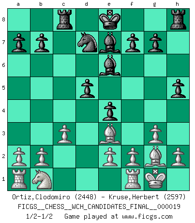 Last move : 1/2-1/2 2020 March 19 21:27:16 [Event "FICGS__CHESS__WCH_CANDIDATES_FINAL__000019"] [Site "FICGS"] [Date "2020.03.02"] [Round "4"] [White "Ortiz,Clodomiro"] [Black "Kruse,Herbert"] [Result "1/2-1/2"] [WhiteElo "2448"] [BlackElo "2597"] 1.Nf3 Nf6 2.g3 c5 3.Bg2 Nc6 4.d4 cxd4 5.Nxd4 e5 6.Nb3 d5 7.Bg5 Be6 8.O-O e4 9.Nd4 Nxd4 10.Qxd4 Be7 11.Qa4+ Qd7 12.Qxd7+ Nxd7 13.Be3 Rc8 14.c3 h5 1/2-1/2 Reti Opening Kingside Castling by player White (move 8) This chess game ended in a draw. Follow this game move after move (download)Chess is life. (Bobby Fischer) Ich suche im Schach immer etwas Eigenes. Riskantes Spiel im Stile schachlicher Musketiere ist nicht meine Sache, auch wenn es vielen Freunden scharfer Wendungen gefällt. (Anatoly Karpov) Una mala movida nulifica cuarenta buenas. (Horowitz) La victoire dans une partie d'Echecs appartient la plupart du temps à celui qui voit un peu plus loin que l'adversaire. (Lasker) Logic : The art of thinking and reasoning in strict accordance with the limitations and incapacities of the human misunderstanding. (Ambrose Bierce)
