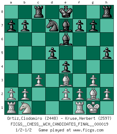 Last move : 1/2-1/2 2020 March 19 21:27:42 [Event "FICGS__CHESS__WCH_CANDIDATES_FINAL__000019"] [Site "FICGS"] [Date "2020.03.02"] [Round "6"] [White "Ortiz,Clodomiro"] [Black "Kruse,Herbert"] [Result "1/2-1/2"] [WhiteElo "2448"] [BlackElo "2597"] 1.Nf3 Nf6 2.g3 c5 3.Bg2 Nc6 4.d4 cxd4 5.Nxd4 e5 6.Nb3 d5 7.Bg5 Be6 8.O-O e4 9.Nd4 Nxd4 10.Qxd4 Be7 11.Qa4+ Qd7 12.Qxd7+ Nxd7 13.Be3 Rc8 14.c3 h5 1/2-1/2 Reti Opening Kingside Castling by player White (move 8) This chess game ended in a draw. Follow this game move after move (download)All I want to do, ever, is just play Chess. (Bobby Fischer) Um sich vor der Gefahr einer Erkältung zu schützen, sorge der wanderlustige König beizeiten für ein brauchbares Versteck. (Aaron Nimzowitsch) Del Ajedrez se ha dicho que la vida no es lo suficientemente larga para él, pero eso es culpa de la vida, no del Ajedrez. (William Ewart Napier) L'action d'une oeuvre littéraire se déroule sur un champ de bataille. Les masques et les types du drame moderne correspondent aux pièces du jeu d'échecs. L'intrigue correspond aux coups et aux gambits, c'est à dire aux techniques du jeu telles qu'utilisées et interprétées par les joueurs. Les tactiques et les péripéties [mouvements] correspondent aux coups exécutés par l'adversaire. (Viktor Shklovsky) The beginning of wisdom is silence. The second step is listening. (Unknown)