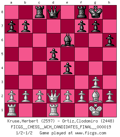 Last move : 1/2-1/2 2020 March 17 13:3:4 [Event "FICGS__CHESS__WCH_CANDIDATES_FINAL__000019"] [Site "FICGS"] [Date "2020.03.02"] [Round "7"] [White "Kruse,Herbert"] [Black "Ortiz,Clodomiro"] [Result "1/2-1/2"] [WhiteElo "2597"] [BlackElo "2448"] 1.Nf3 Nf6 2.g3 c5 3.Bg2 Nc6 4.d4 cxd4 5.Nxd4 e5 6.Nb3 d5 7.Bg5 Be6 8.O-O e4 9.Nd4 Nxd4 10.Qxd4 Be7 11.Nc3 O-O 12.Rfd1 h6 13.Bxf6 Bxf6 14.Qd2 Bxc3 15.Qxc3 Rc8 16.Qd2 1/2-1/2 Reti Opening Kingside Castling by player White (move 8) Kingside Castling by player Black (move 11) This chess game ended in a draw. Follow this game move after move (download)Chess holds its master in its own bonds, shackling the mind and brain so that the inner freedom of the very strongest must suffer. (Albert Einstein) Die Idee von Capablanca, Schach als Fach in den Schulen zu lehren, ist großartig. (Fidel Castro) El Ajedrez es el juego mas altamente simbólico, pero las agresiones estan por lo tanto aún mas francamente representadas en la partida. Tal vez comenzo como un juego de guerra; Algo como la representación de una batalla en miniatura entre las fuerzas de dos reinos. (Karl Meninger) Vous n'êtes pas toujours obligé de jouer le meilleur coup. Un coup doit être actif, entreprenant, correct et beau ! (David Bronstein) The right perception of any matter and a misunderstanding of the same matter do not wholly exclude each other. (Kafka's the trial)
