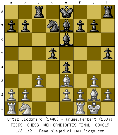 Last move : 1/2-1/2 2020 March 19 21:28:0 [Event "FICGS__CHESS__WCH_CANDIDATES_FINAL__000019"] [Site "FICGS"] [Date "2020.03.02"] [Round "8"] [White "Ortiz,Clodomiro"] [Black "Kruse,Herbert"] [Result "1/2-1/2"] [WhiteElo "2448"] [BlackElo "2597"] 1.Nf3 Nf6 2.g3 c5 3.Bg2 Nc6 4.d4 cxd4 5.Nxd4 e5 6.Nb3 d5 7.Bg5 Be6 8.O-O e4 9.Nd4 Nxd4 10.Qxd4 Be7 11.Qa4+ Qd7 12.Qxd7+ Nxd7 13.Be3 Rc8 14.c3 h5 1/2-1/2 Reti Opening Kingside Castling by player White (move 8) This chess game ended in a draw. Follow this game move after move (download)Bobby just drops the pieces and they fall on the right squares. (Miguel Najdorf) Vielleicht wirkt die Aura früherer Spieler glanzvoller als die der heutigen Spieler, aber das liegt daran, dass man kein Programm wie Fritz hatte, das einem all die Löcher in ihren Partien zeigt. (Vladimir Kramnik) Debió haber existido una vez en que los hombres eran semidióses, de otra manera no hubiesen podido inventar el Ajedrez. (Gustav Schenk) On peut tirer plus d'utilité d'une partie perdue que de 100 parties gagnées. (Capablanca) I have opinions of my own - strong opinions - but I don't always agree with them. (George Bush)