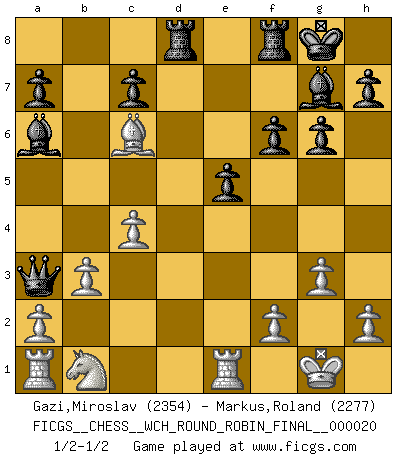 Last move : 1/2-1/2 2020 April 26 11:15:19 [Event "FICGS__CHESS__WCH_ROUND_ROBIN_FINAL__000020"] [Site "FICGS"] [Date "2020.03.02"] [Round "1"] [White "Gazi,Miroslav"] [Black "Markus,Roland"] [Result "1/2-1/2"] [WhiteElo "2354"] [BlackElo "2277"] 1.e4 e5 2.Nf3 Nc6 3.d4 exd4 4.Nxd4 Nf6 5.Nxc6 bxc6 6.e5 Qe7 7.Qe2 Nd5 8.c4 Ba6 9.b3 g6 10.g3 Bg7 11.Bb2 O-O 12.Bh3 f6 13.e6 Rfe8 14.O-O dxe6 15.Bg2 Rad8 16.Re1 e5 17.Ba3 Qf7 18.Qb2 Ne7 19.Bxe7 Qxe7 20.Bxc6 Rf8 21.Qa3 Qxa3 1/2-1/2 Scotch : Mieses variation Kingside Castling by player Black (move 11) Kingside Castling by player White (move 14) This chess game ended in a draw. Follow this game move after move (download)Some sacrifices are sound; the rest are mine. (Mikhail Tal) Du musst nicht gut spielen, es reicht, wenn du besser spielst als dein Gegner. (Anonymous) Cuando la partida de Ajedrez termina, el Peón y el Rey regresan a la misma caja. (Irish saying) Il a essayé de se convaincre qu'il pourrait empêcher toutes les erreurs et ne jamais perdre. L'horreur ! Gary Kasparov au sujet de Robert Fischer. You think that education is too expensive ? Try ignorance. (Derek Bok)