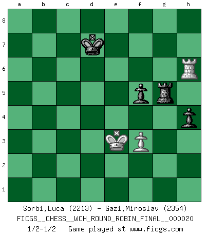 Last move : 1/2-1/2 2020 August 24 21:43:49 [Event "FICGS__CHESS__WCH_ROUND_ROBIN_FINAL__000020"] [Site "FICGS"] [Date "2020.03.02"] [Round "1"] [White "Sorbi,Luca"] [Black "Gazi,Miroslav"] [Result "1/2-1/2"] [WhiteElo "2213"] [BlackElo "2354"] 1.e4 c5 2.Nf3 d6 3.d4 cxd4 4.Nxd4 Nf6 5.Nc3 a6 6.Be3 e5 7.Nb3 Be6 8.f3 h5 9.Nd5 Bxd5 10.exd5 Nbd7 11.Qd2 g6 12.Be2 Bg7 13.O-O b6 14.c4 O-O 15.Rae1 Re8 16.Kh1 Rb8 17.Bg5 Qc7 18.Bd3 a5 19.Qd1 Nh7 20.Be3 Nhf6 21.Bg5 e4 22.fxe4 Ng4 23.Qe2 a4 24.Nc1 Nge5 25.b3 Nc5 26.Bc2 axb3 27.axb3 b5 28.cxb5 Qb6 29.b4 Ncd7 30.Bd2 Rec8 31.Bd3 Qd4 32.Bb1 Qb2 33.Nd3 Nxd3 34.Bxd3 Bc3 35.Rd1 Bxb4 36.Bf4 Qxe2 37.Bxe2 Rc2 38.Rb1 Bc5 39.Bd3 Ra2 40.h3 f6 41.Rfc1 Ne5 42.Bf1 Kf7 43.Ra1 Rf2 44.Bh2 Rb2 45.Bg1 Nd7 46.Bxc5 Nxc5 47.Ra7+ Kg8 48.Kh2 h4 49.Re7 Ra8 50.Rc7 Nxe4 51.Rd7 Nd2 52.Be2 Ne4 53.Bf3 Ng5 54.Bd1 Nf7 55.R1c7 Rf8 56.Re7 Rxb5 57.Ba4 Rc5 58.Ra7 f5 59.Be8 Ng5 60.Rg7+ Kh8 61.Rxg6 Nf3+ 62.gxf3 Rc2+ 63.Rg2 Rxg2+ 64.Kxg2 Rxe8 65.Rd7 Re2+ 66.Kf1 Rh2 67.Rxd6 Rxh3 68.Kg2 Rg3+ 69.Kf2 Kg7 70.Rc6 Rg5 71.d6 Kf7 72.d7 Ke7 73.Rh6 Kxd7 74.Ke3 1/2-1/2 Sicilian : Najdorf, Byrne (English) attack Kingside Castling by player White (move 13) Kingside Castling by player Black (move 14) 10 pieces endgame at move 64 : White KRPPP , Black KRPPP WHITE : King + 1 Rook 3 Pawns BLACK : King + 1 Rook 3 Pawns 9 pieces endgame at move 67 : White KRPPP , Black KRPP WHITE : King + 1 Rook 3 Pawns BLACK : King + 1 Rook 2 Pawns 8 pieces endgame at move 67 : White KRPP , Black KRPP WHITE : King + 1 Rook 2 Pawns BLACK : King + 1 Rook 2 Pawns 7 pieces endgame at move 73 : White KRP , Black KRPP WHITE : King + 1 Rook 1 Pawn BLACK : King + 1 Rook 2 Pawns This chess game ended in a draw. Follow this game move after move (download)Human affairs are like a Chess game: only those who do not take it seriously can be called good players. (Hung Tzu Ch'eng) Der Knackpunkt bei der Konzentration ist, daß wir nur durch sie etwas Neues und Ungewöhnliches am Schachbrett finden können. Sie ist der einzige Weg durch neue neue Ideen eine Überraschung zu bereiten. (Garry Kasparov) El Ajedrez moderno está demasiado preocupado con cosas como la estructura de Peones. Olvidenlo, el Jaque Mate termina la partida. (Nigel Short) Seul un grand joueur sait à quel point il joue faiblement. (Xavier Tartacover) He who defends everything defends nothing. (Frederick the Great)